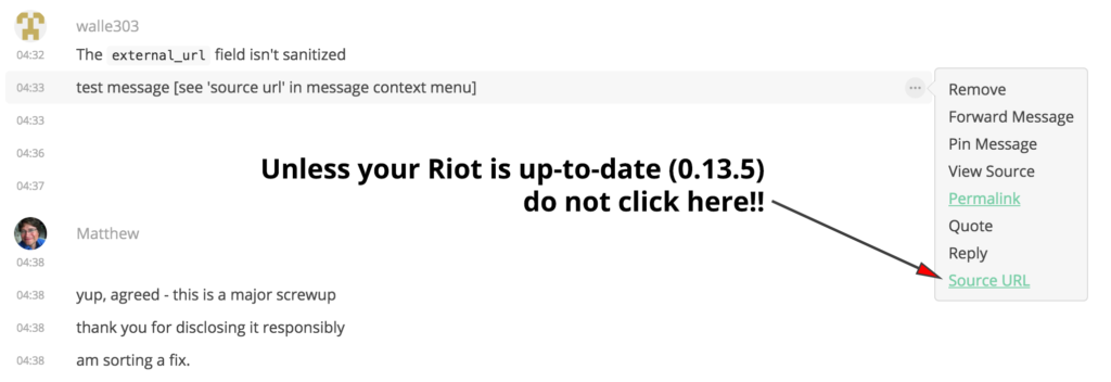 The issue lies in the relatively obscure external_url feature, which lets bridges specify a URL for bridged events, letting Riot/Web users link through to the 'original' event (e.g. a twitter URL on a bridged tweet). The option is hidden in a context menu and labelled "Source URL", and is only visible on events which have the external_url field set. Unfortunately Riot/Web didn't sanitise the URL correctly, allowing a malicious URL to be injected - and this has been the case since the feature landed in Riot 0.9.0 (Nov 2016).